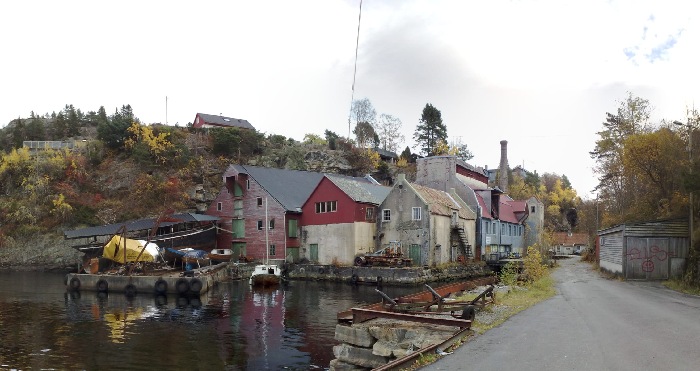This was originally a mill, then a wool-factory and later a herring oil factory. Today the buildings host a paint factory. Here is an air-shot of the buildings, taken in July 1960. The area is called Kverneviken. (Mill Creek)