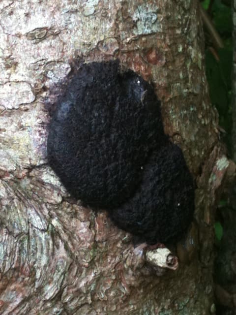 Please forgive this being a really simplistic answer, but it looks like some sort of a fungus to me. It may also be the nest for the larva of some sort of tree wasp.