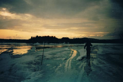 The photo is taken with an old Zenith camera. :)Jeg driver og skanner gamle bilder og dette fra 91 eller 92 bringer mange minner. Denne dagen skulle vi sjekke sikkerheten på Pasvikelva og hvordan isen var, den var i ferd med å smelte men folk gikk der fremdeles. Siden jeg var den letteste den dagen måtte jeg gå først på de verste områdene..