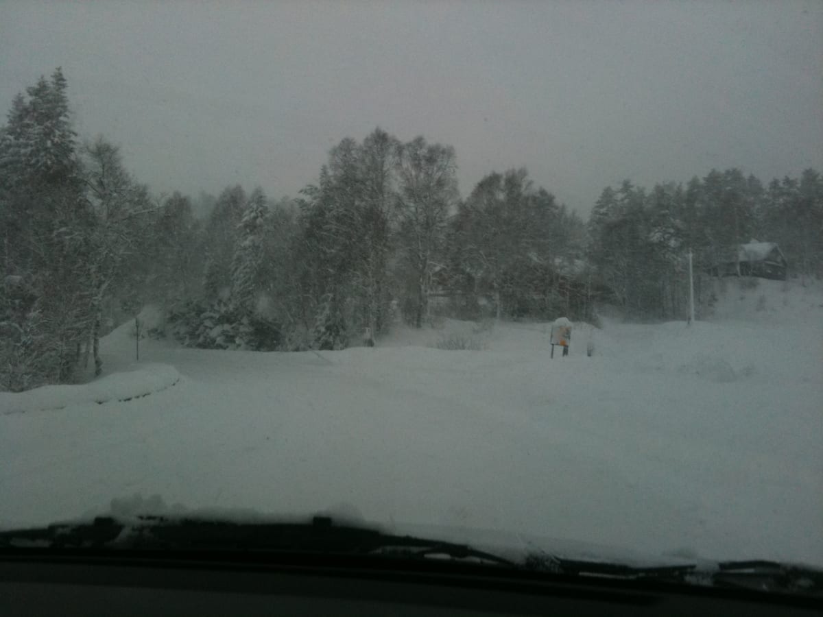 Å kjøre hjem var et prosjekt i seg selv, vi måtte vente på brøytebil for å komme oss ut til hovedveien. Det hadde snødd minst 60cm i løpet av natten. (se video nederst)