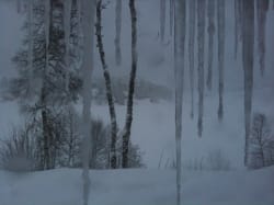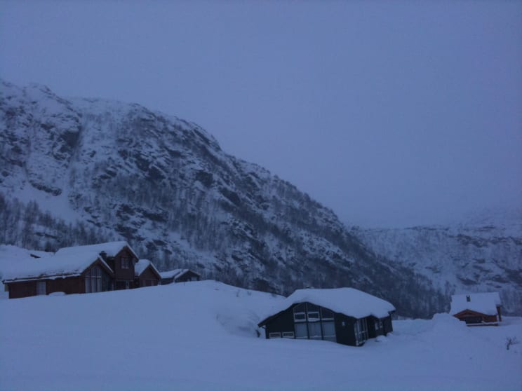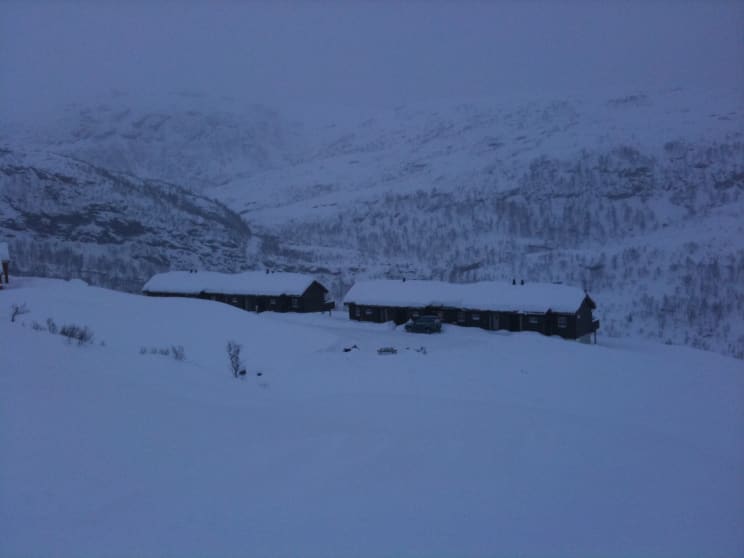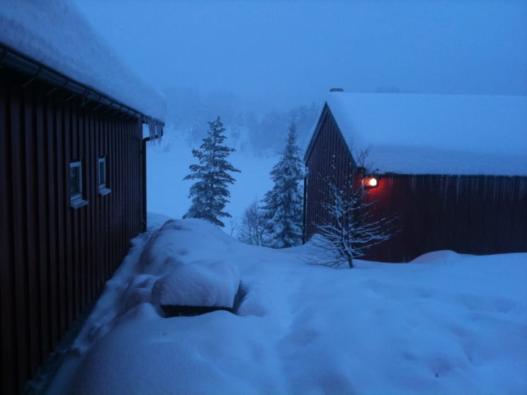Utsikten fra hytten og nabohytten, det snødde og snødde.
