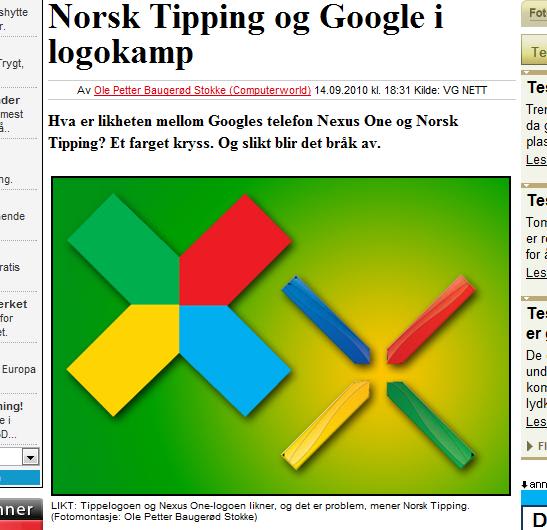 Google in logo fight with Norsk Tipping[/lang_en][/fusion_builder_column][fusion_builder_column type=»1_1″ background_position=»left top» background_color=»» border_size=»» border_color=»» border_style=»solid» spacing=»yes» background_image=»» background_repeat=»no-repeat» padding=»» margin_top=»0px» margin_bottom=»0px» class=»» id=»» animation_type=»» animation_speed=»0.3″ animation_direction=»left» hide_on_mobile=»no» center_content=»no» min_height=»none»][lang_nb-no]Google er i konflikt med Norsk Tipping fordi de synes Norsk Tipping har gjort logoen sin alt for lik Nexus One. Norsk Tipping på sin side nekter på at de har endret logoen.